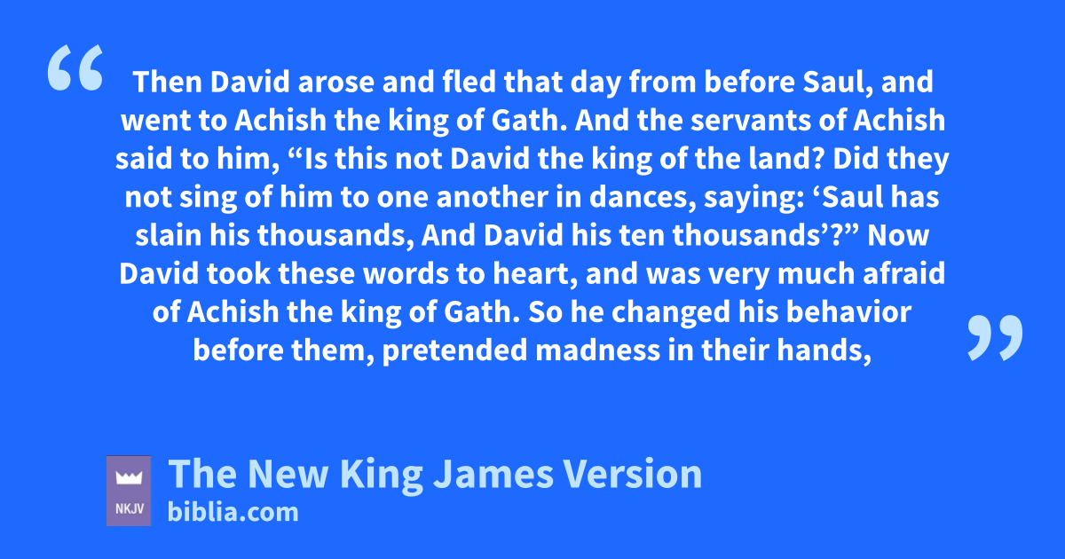 12 Now David ntook these words 4to heart, and was very much afraid of Achish the king of Gath. 13 So ohe changed his behavior before them, pretended 5madness in their hands, 6scratched on the doors of the gate, and let his saliva fall down on his beard. 14 Then Achish said to his servants, “Look, you see the man is insane. Why have you brought him to me? 15 Have I need of madmen, that you have brought this fellow to play the madman in my presence? Shall this fellow come into my house?”