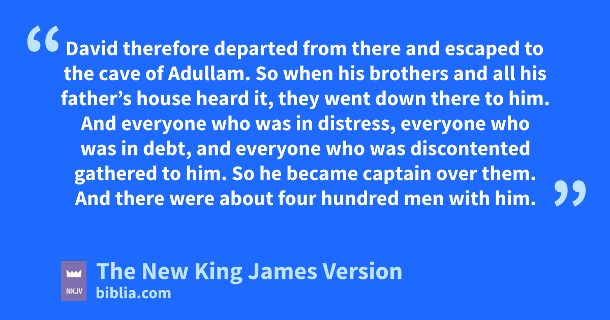 22 David therefore departed from there and aescaped bto the cave of Adullam. So when his brothers and all his father’s house heard it, they went down there to him. 2 cAnd everyone who was in distress, everyone who was in debt, and everyone who was 1discontented gathered to him. So he became captain over them. And there were about dfour hundred men with him.