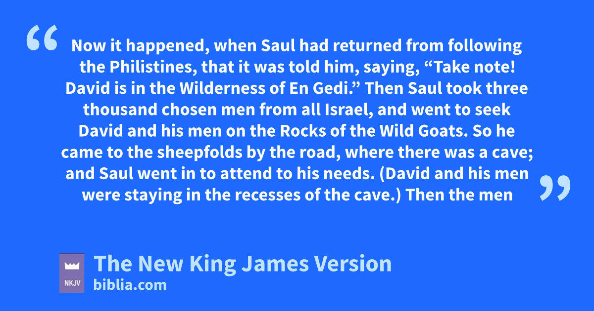 24 Now it happened, awhen Saul had returned from following the Philistines, that it was told him, saying, “Take note! David is in the Wilderness of En Gedi.” 2 Then Saul took three thousand chosen men from all Israel, and bwent to seek David and his men on the Rocks of the Wild Goats. 3 So he came to the sheepfolds by the road, where there was a cave; and cSaul went in to dattend to his needs. (eDavid and his men were staying in the recesses of the cave.) 4 fThen the men of David said to him, “This is the day of which the Lord said to you, ‘Behold, I will deliver your enemy into your hand, that you may do to him as it seems good to you.’ ” And David arose and secretly cut off a corner of Saul’s robe. 5 Now it happened afterward that gDavid’s heart troubled him because he had cut Saul’s robe. 6 And he said to his men, h“The Lord forbid that I should do this thing to my master, the Lord’s anointed, to stretch out my hand against him, seeing he is the anointed of the Lord.” 7 So David irestrained his servants with these words, and did not allow them to rise against Saul. And Saul got up from the cave and went on his way.