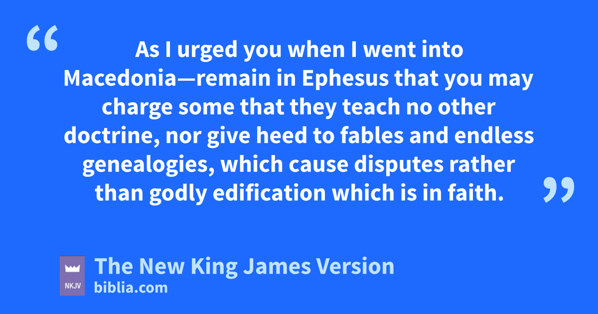 3 As I urged you cwhen I went into Macedonia—remain in Ephesus that you may 1charge some dthat they teach no other doctrine, 4 enor give heed to fables and endless genealogies, which cause disputes rather than godly edification which is in faith. 5 Now fthe purpose of the commandment is love gfrom a pure heart, from a good conscience, and from 2sincere faith, 6 from which some, having strayed, have turned aside to hidle talk, 7 desiring to be teachers of the law, understanding neither what they say nor the things which they affirm.