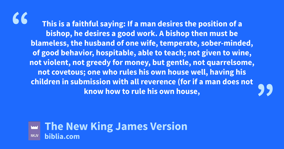 3 This is a faithful saying: If a man desires the position of a 1bishop, he desires a good work. 2 A bishop then must be blameless, the husband of one wife, temperate, sober-minded, of good behavior, hospitable, able to teach; 3 not 2given to wine, not violent, 3not greedy for money, but gentle, not quarrelsome, not 4covetous; 4 one who rules his own house well, having his children in submission with all reverence 5 (for if a man does not know how to rule his own house, how will he take care of the church of God?); 6 not a 5novice, lest being puffed up with pride he fall into the same condemnation as the devil. 7 Moreover he must have a good testimony among those who are outside, lest he fall into reproach and the asnare of the devil.