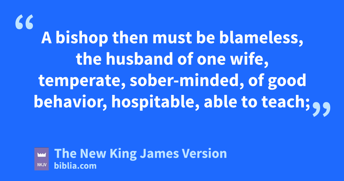 3 This is a faithful saying: If a man desires the position of a 1bishop, he desires a good work. 2 A bishop then must be blameless, the husband of one wife, temperate, sober-minded, of good behavior, hospitable, able to teach; 3 not 2given to wine, not violent, 3not greedy for money, but gentle, not quarrelsome, not 4covetous; 4 one who rules his own house well, having his children in submission with all reverence 5 (for if a man does not know how to rule his own house, how will he take care of the church of God?); 6 not a 5novice, lest being puffed up with pride he fall into the same condemnation as the devil. 7 Moreover he must have a good testimony among those who are outside, lest he fall into reproach and the asnare of the devil.
