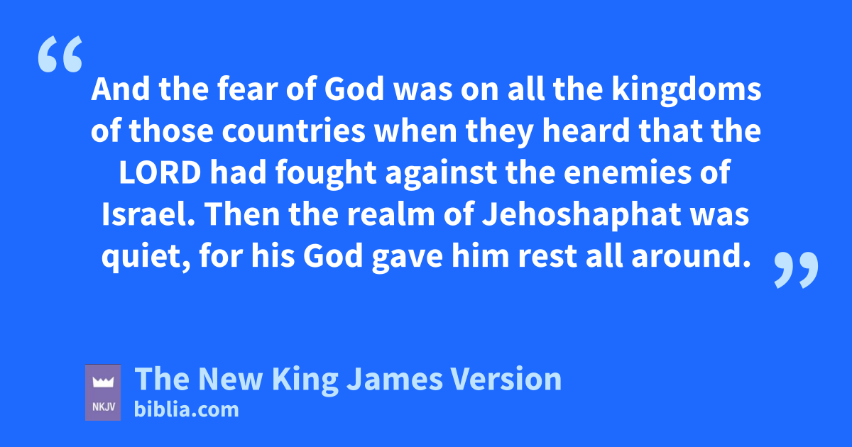 25 When Jehoshaphat and his people came to take away their spoil, they found among them an abundance of valuables on the 6dead bodies, and precious jewelry, which they stripped off for themselves, more than they could carry away; and they were three days gathering the spoil because there was so much. 26 And on the fourth day they assembled in the Valley of 7Berachah, for there they blessed the Lord; therefore the name of that place was called The Valley of Berachah until this day. 27 Then they returned, every man of Judah and Jerusalem, with Jehoshaphat in front of them, to go back to Jerusalem with joy, for the Lord had hmade them rejoice over their enemies. 28 So they came to Jerusalem, with stringed instruments and harps and trumpets, to the house of the Lord. 29 And ithe fear of God was on all the kingdoms of those countries when they heard that the Lord had fought against the enemies of Israel. 30 Then the realm of Jehoshaphat was quiet, for his jGod gave him rest all around.