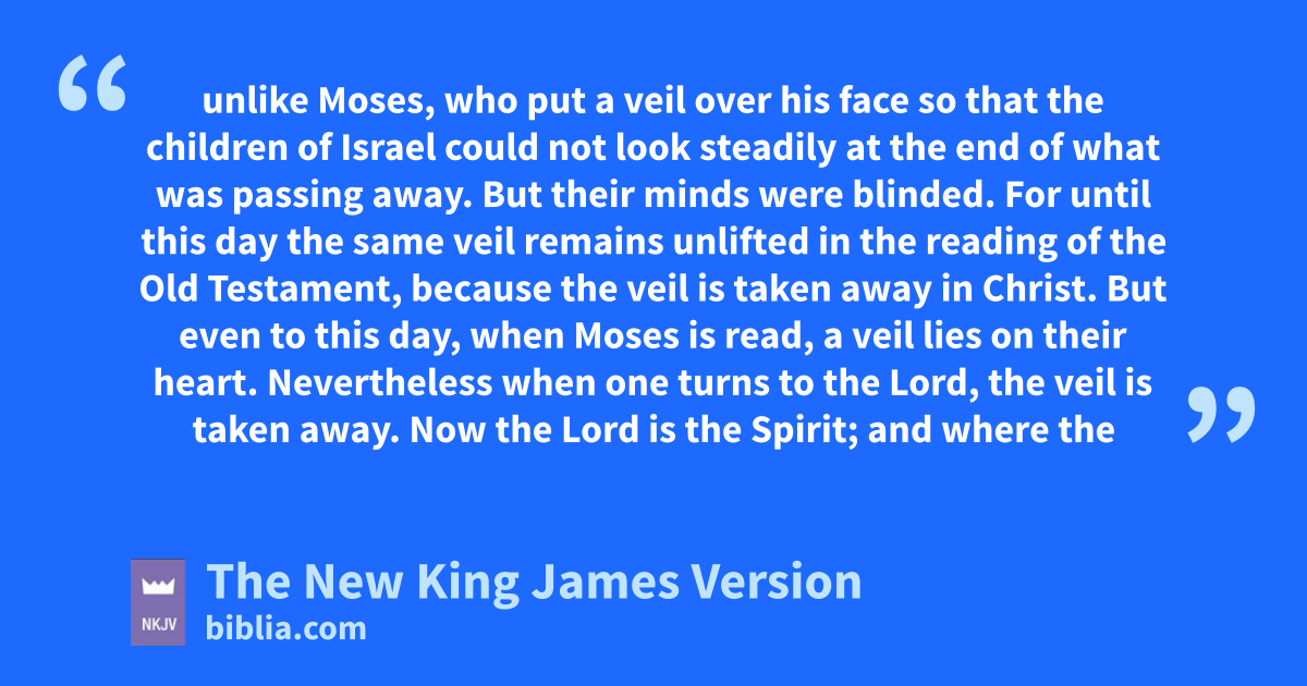 12 Therefore, since we have such hope, swe use great boldness of speech—13 unlike Moses, twho put a veil over his face so that the children of Israel could not look steadily at uthe end of what was passing away. 14 But vtheir minds were blinded. For until this day the same veil remains unlifted in the reading of the Old Testament, because the veil is taken away in Christ. 15 But even to this day, when Moses is read, a veil lies on their heart. 16 Nevertheless wwhen one turns to the Lord, xthe veil is taken away. 17 Now ythe Lord is the Spirit; and where the Spirit of the Lord is, there is zliberty. 18 But we all, with unveiled face, beholding aas in a mirror bthe glory of the Lord, care being transformed into the same image from glory to glory, just as 2by the Spirit of the Lord.