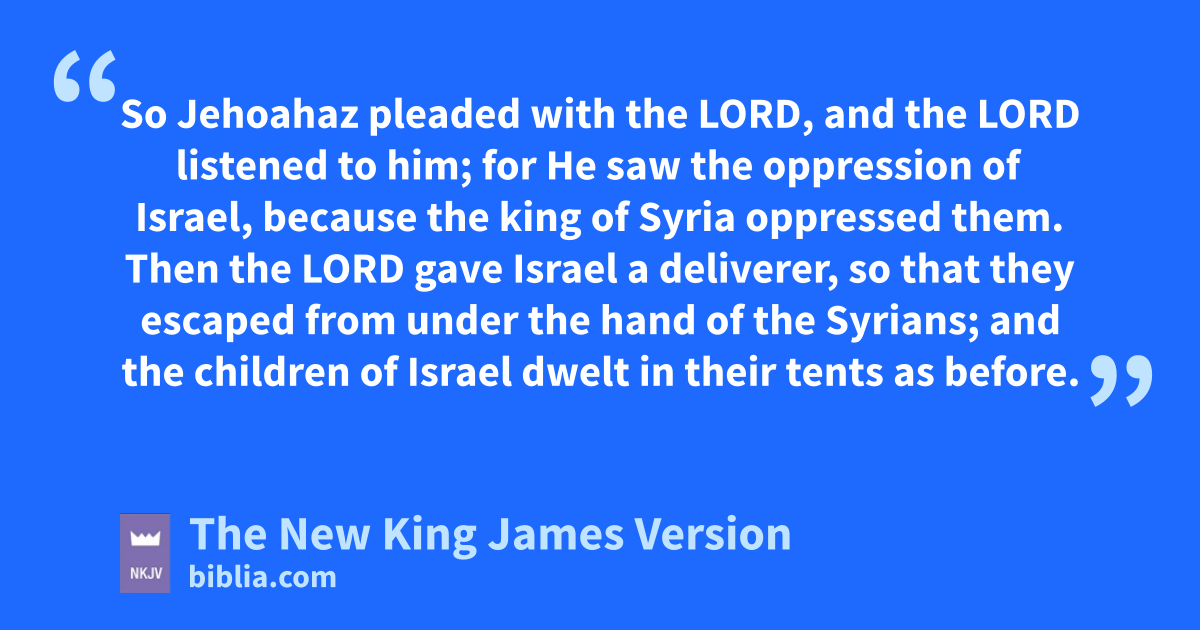 3 Then dthe anger of the Lord was aroused against Israel, and He delivered them into the hand of eHazael king of Syria, and into the hand of fBen-Hadad the son of Hazael, all their days. 4 So Jehoahaz gpleaded with the Lord, and the Lord listened to him; for hHe saw the oppression of Israel, because the king of Syria oppressed them. 5 iThen the Lord gave Israel a deliverer, so that they escaped from under the hand of the Syrians; and the children of Israel dwelt in their tents as before. 6 Nevertheless they did not depart from the sins of the house of Jeroboam, who had made Israel sin, but walked in them; jand the 3wooden image also remained in Samaria. 7 For He left of the army of Jehoahaz only fifty horsemen, ten chariots, and ten thousand foot soldiers; for the king of Syria had destroyed them kand made them llike the dust at threshing.