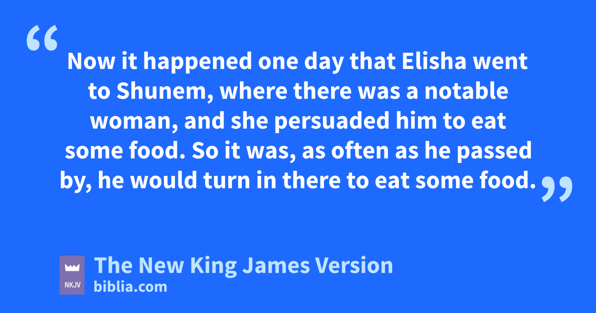 8 Now it happened one day that Elisha went to dShunem, where there was a 1notable woman, and she 2persuaded him to eat some food. So it was, as often as he passed by, he would turn in there to eat some food. 9 And she said to her husband, “Look now, I know that this is a holy man of God, who passes by us regularly. 10 Please, let us make 3a small upper room on the wall; and let us put a bed for him there, and a table and a chair and a lampstand; so it will be, whenever he comes to us, he can turn in there.”