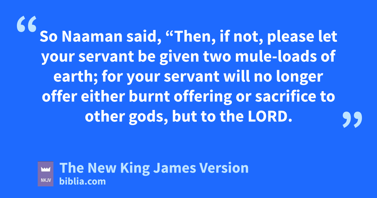 17 So Naaman said, “Then, if not, please let your servant be given two mule-loads of earth; for your servant will no longer offer either burnt offering or sacrifice to other gods, but to the Lord. 18 Yet in this thing may the Lord pardon your servant: when my master goes into the temple of Rimmon to worship there, and nhe leans on my hand, and I bow down in the temple of Rimmon—when I bow down in the temple of Rimmon, may the Lord please pardon your servant in this thing.”
