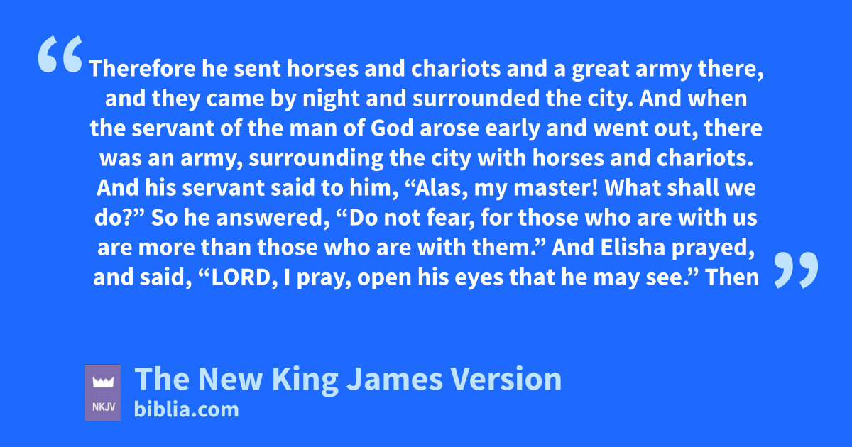 14 Therefore he sent horses and chariots and a great army there, and they came by night and surrounded the city. 15 And when the servant of the man of God arose early and went out, there was an army, surrounding the city with horses and chariots. And his servant said to him, “Alas, my master! What shall we do?”