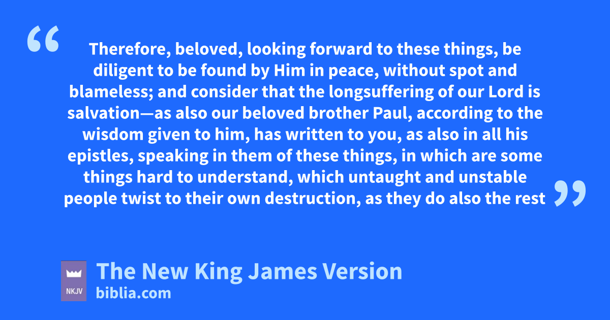 14 Therefore, beloved, looking forward to these things, be diligent xto be found by Him in peace, without spot and blameless; 15 and consider that ythe longsuffering of our Lord is salvation—as also our beloved brother Paul, according to the wisdom given to him, has written to you, 16 as also in all his zepistles, speaking in them of these things, in which are some things hard to understand, which untaught and unstable people twist to their own destruction, as they do also the arest of the Scriptures.
