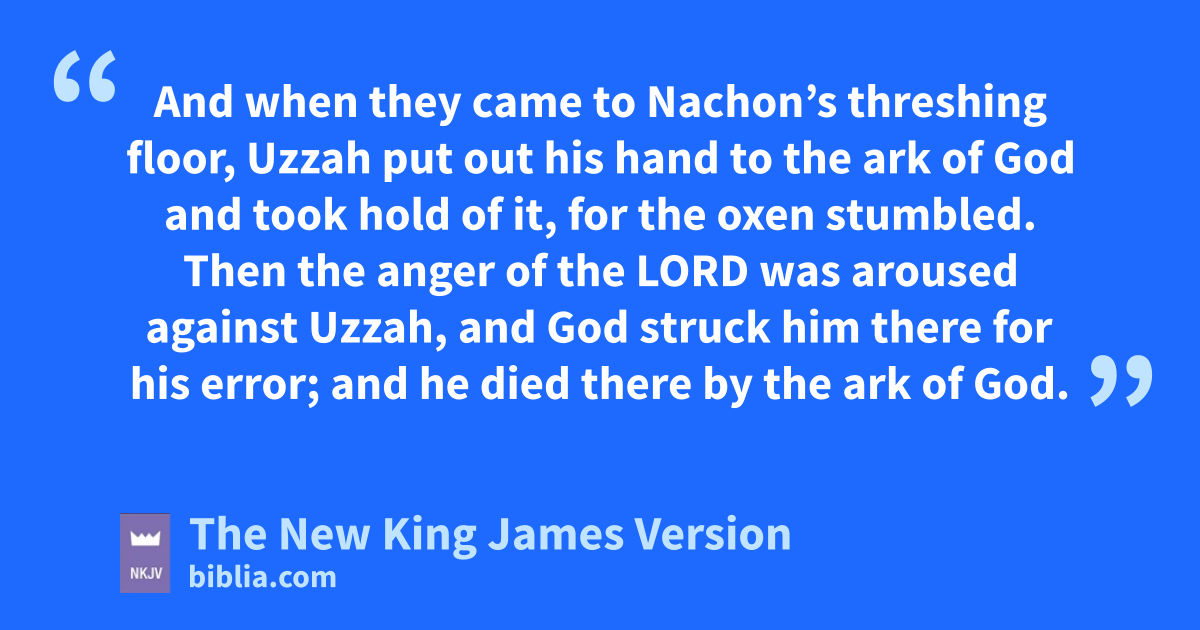 6 And when they came to fNachon’s threshing floor, Uzzah put out his ghand to the ark of God and 4took hold of it, for the oxen stumbled. 7 Then the anger of the Lord was aroused against Uzzah, and God struck him there for his 5error; and he died there by the ark of God. 8 And David became angry because of the Lord’s outbreak against Uzzah; and he called the name of the place 6Perez Uzzah to this day.