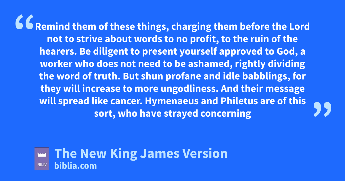 14 Remind them of these things, tcharging them before the Lord not to 4strive about words to no profit, to the ruin of the hearers. 15 uBe diligent to present yourself approved to God, a worker who does not need to be ashamed, rightly dividing the word of truth. 16 But shun profane and 5idle babblings, for they will 6increase to more ungodliness. 17 And their message will spread like cancer. vHymenaeus and Philetus are of this sort, 18 who have strayed concerning the truth, wsaying that the resurrection is already past; and they overthrow the faith of some. 19 Nevertheless xthe solid foundation of God stands, having this seal: “The Lord yknows those who are His,” and, “Let everyone who names the name of 7Christ depart from iniquity.”