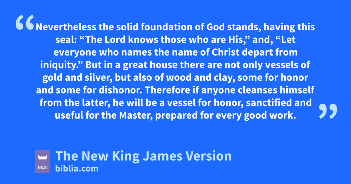 20 But in a great house there are not only zvessels of gold and silver, but also of wood and clay, some for honor and some for dishonor. 21 Therefore if anyone cleanses himself from the latter, he will be a vessel for honor, 8sanctified and useful for the Master, aprepared for every good work. 22 bFlee also youthful lusts; but pursue righteousness, faith, love, peace with those who call on the Lord out of a pure heart. 23 But avoid foolish and ignorant disputes, knowing that they generate strife. 24 And ca servant of the Lord must not quarrel but be gentle to all, dable to teach, epatient, 25 fin humility correcting those who are in opposition, gif God perhaps will grant them repentance, hso that they may know the truth, 26 and that they may come to their senses and iescape the snare of the devil, having been taken captive by him to do his will.