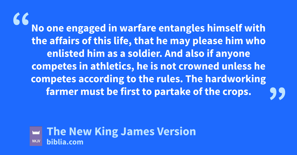 2 You therefore, amy son, bbe strong in the grace that is in Christ Jesus. 2 And the things that you have heard from me among many witnesses, commit these to faithful men who will be able to teach others also. 3 You therefore must cendure 1hardship das a good soldier of Jesus Christ. 4 eNo one engaged in warfare entangles himself with the affairs of this life, that he may please him who enlisted him as a soldier. 5 And also fif anyone competes in athletics, he is not crowned unless he competes according to the rules. 6 The hardworking farmer must be first to partake of the crops. 7 Consider what I say, and 2may the Lord ggive you understanding in all things.