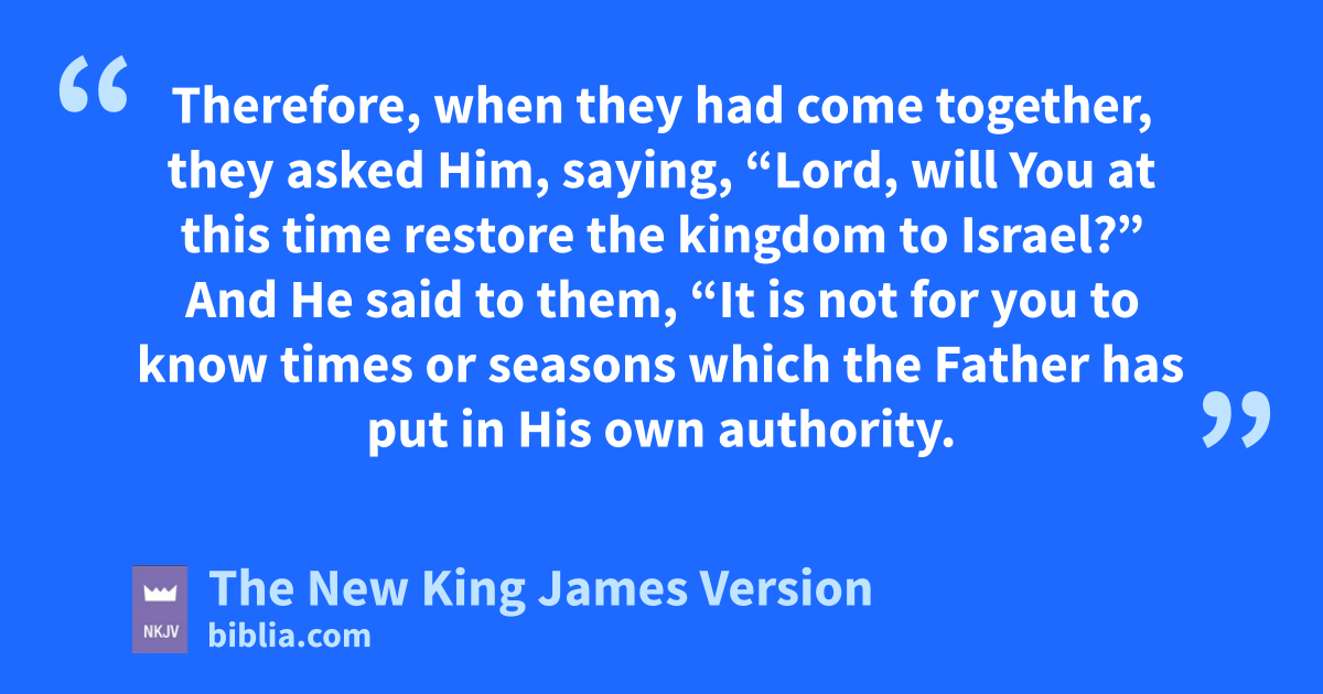 4 eAnd being assembled together with them, He commanded them not to depart from Jerusalem, but to wait for the Promise of the Father, “which,” He said, “you have fheard from Me; 5 gfor John truly baptized with water, hbut you shall be baptized with the Holy Spirit not many days from now.” 6 Therefore, when they had come together, they asked Him, saying, “Lord, will You at this time restore the kingdom to Israel?” 7 And He said to them, i“It is not for you to jknow times or seasons which the Father has put in His own authority. 8 kBut you shall receive power lwhen the Holy Spirit has come upon you; and myou shall be 3witnesses to Me in Jerusalem, and in all Judea and nSamaria, and to the oend of the earth.”