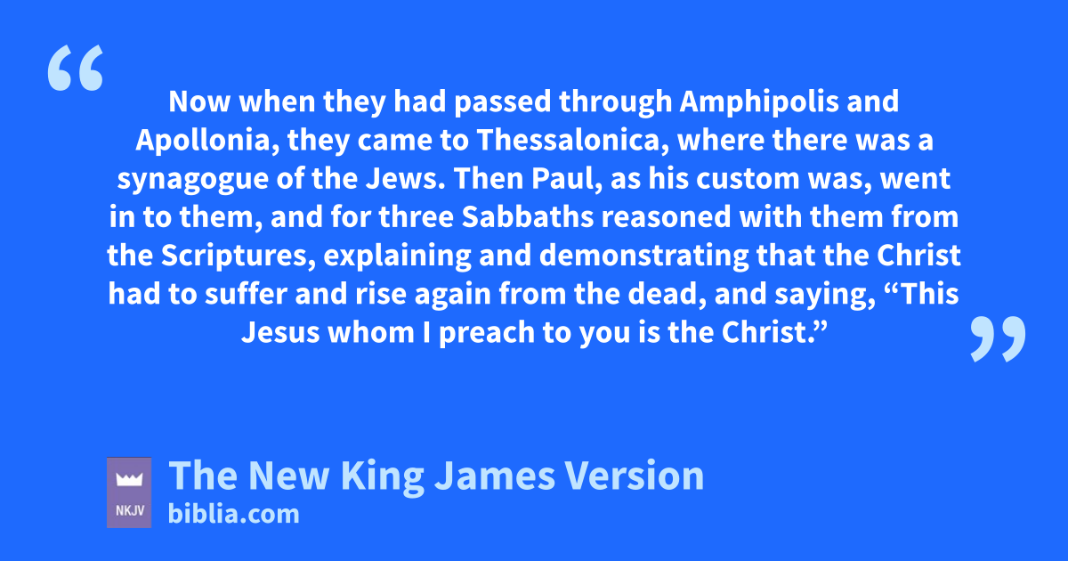 17 Now when they had passed through Amphipolis and Apollonia, they came to aThessalonica, where there was a synagogue of the Jews. 2 Then Paul, as his custom was, bwent in to them, and for three Sabbaths creasoned with them from the Scriptures, 3 explaining and demonstrating dthat the Christ had to suffer and rise again from the dead, and saying, “This Jesus whom I preach to you is the Christ.” 4 eAnd some of them were persuaded; and a great multitude of the devout Greeks, and not a few of the leading women, joined Paul and fSilas.