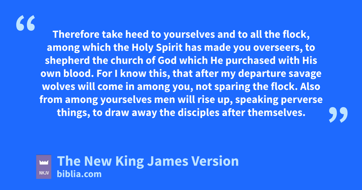 25 “And indeed, now I know that you all, among whom I have gone preaching the kingdom of God, will see my face no more. 26 Therefore I testify to you this day that I am einnocent 5of the blood of all men. 27 For I have not 6shunned to declare to you fthe whole counsel of God. 28 gTherefore take heed to yourselves and to all the flock, among which the Holy Spirit hhas made you overseers, to shepherd the church 7of God iwhich He purchased jwith His own blood. 29 For I know this, that after my departure ksavage wolves will come in among you, not sparing the flock. 30 Also lfrom among yourselves men will rise up, speaking 8perverse things, to draw away the disciples after themselves. 31 Therefore watch, and remember that mfor three years I did not cease to warn everyone night and day with tears.