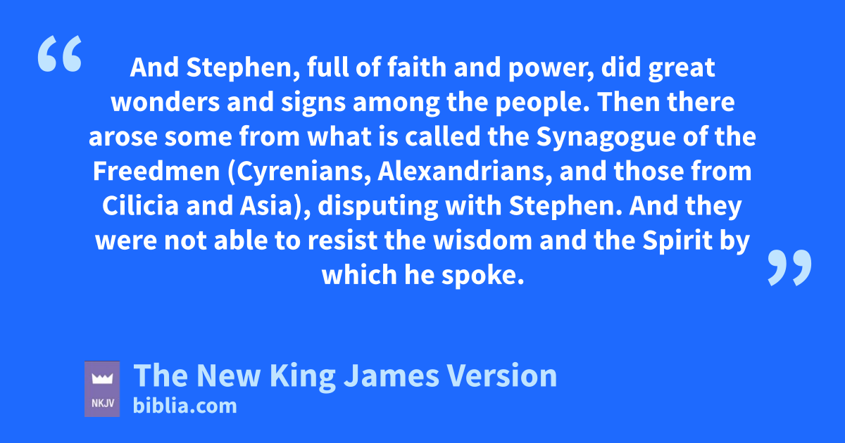 8 And Stephen, full of 2faith and power, did great owonders and signs among the people. 9 Then there arose some from what is called the Synagogue of the Freedmen (Cyrenians, Alexandrians, and those from Cilicia and Asia), disputing with Stephen. 10 And pthey were not able to resist the wisdom and the Spirit by which he spoke. 11 qThen they secretly induced men to say, “We have heard him speak blasphemous words against Moses and God.” 12 And they stirred up the people, the elders, and the scribes; and they came upon him, seized him, and brought him to the council. 13 They also set up false witnesses who said, “This man does not cease to speak 3blasphemous words against this holy place and the law; 14 rfor we have heard him say that this Jesus of Nazareth will destroy this place and change the customs which Moses delivered to us.” 15 And all who sat in the council, looking steadfastly at him, saw his face as the face of an angel.