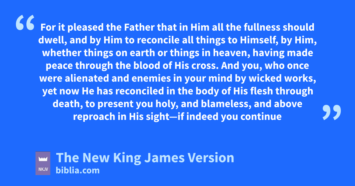 19 For it pleased the Father that min Him all the fullness should dwell, 20 and nby Him to reconcile oall things to Himself, by Him, whether things on earth or things in heaven, phaving made peace through the blood of His cross.