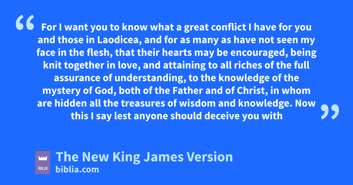 2 For I want you to know what a great aconflict 1I have for you and those in Laodicea, and for as many as have not seen my face in the flesh, 2 that their hearts may be encouraged, being knit together in love, and attaining to all riches of the full assurance of understanding, to the knowledge of the mystery of God, 2both of the Father and of Christ, 3 bin whom are hidden all the treasures of wisdom and knowledge.