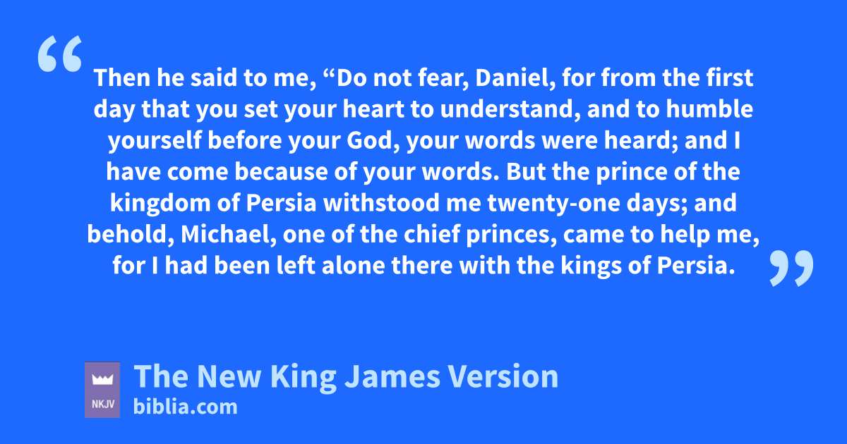 12 Then he said to me, g“Do not fear, Daniel, for from the first day that you set your heart to understand, and to humble yourself before your God, hyour words were heard; and I have come because of your words. 13 iBut the prince of the kingdom of Persia withstood me twenty-one days; and behold, jMichael, one of the chief princes, came to help me, for I had been left alone there with the kings of Persia. 14 Now I have come to make you understand what will happen to your people kin the latter days, lfor the vision refers to many days yet to come.”