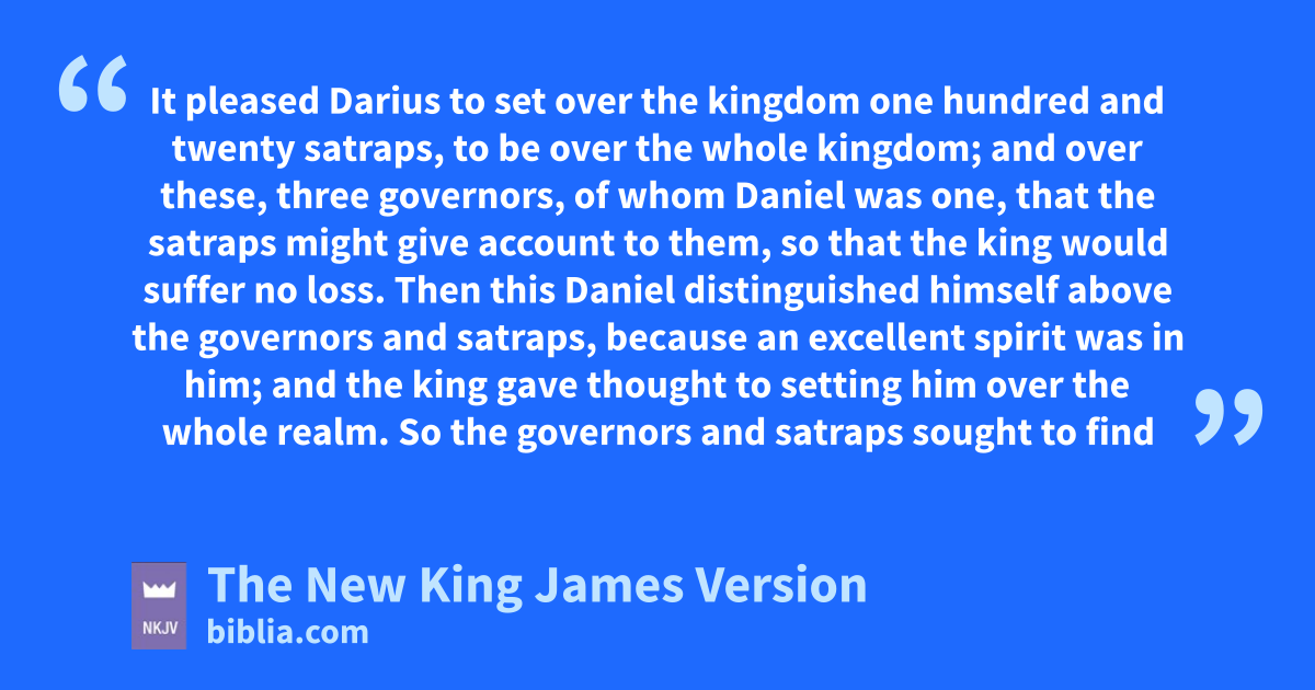 6 It pleased Darius to set over the kingdom one hundred and twenty satraps, to be over the whole kingdom; 2 and over these, three governors, of whom Daniel was one, that the satraps might give account to them, so that the king would suffer no loss. 3 Then this Daniel distinguished himself above the governors and satraps, abecause an excellent spirit was in him; and the king gave thought to setting him over the whole realm. 4 bSo the governors and satraps sought to find some charge against Daniel concerning the kingdom; but they could find no charge or fault, because he was faithful; nor was there any error or fault found in him. 5 Then these men said, “We shall not find any charge against this Daniel unless we find it against him concerning the law of his God.”