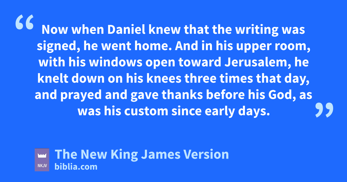 10 Now when Daniel knew that the writing was signed, he went home. And in his upper room, with his windows open ftoward Jerusalem, he knelt down on his knees gthree times that day, and prayed and gave thanks before his God, as was his custom since early days.
