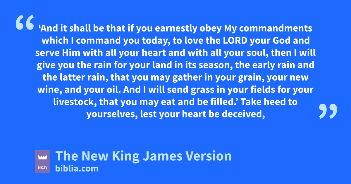 13 ‘And it shall be that if you earnestly 5obey My commandments which I command you today, to love the Lord your God and serve Him with all your heart and with all your soul, 14 then jI 6will give you the rain for your land in its season, kthe early rain and the latter rain, that you may gather in your grain, your new wine, and your oil. 15 lAnd I will send grass in your fields for your livestock, that you may meat and be 7filled.’ 16 Take heed to yourselves, nlest your heart be deceived, and you turn aside and oserve other gods and worship them, 17 lest pthe Lord’s anger be aroused against you, and He qshut up the heavens so that there be no rain, and the land yield no produce, and ryou perish quickly from the good land which the Lord is giving you.