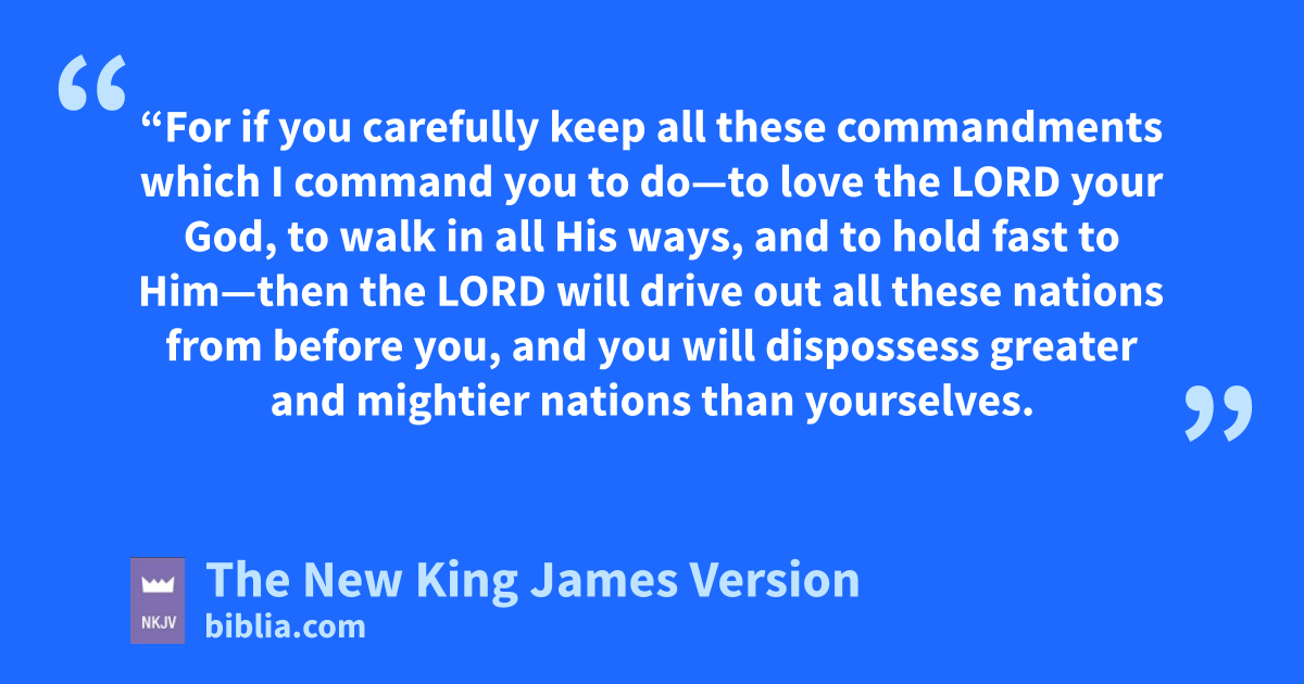 22 “For if zyou carefully keep all these commandments which I command you to do—to love the Lord your God, to walk in all His ways, and ato hold fast to Him—23 then the Lord will bdrive out all these nations from before you, and you will cdispossess greater and mightier nations than yourselves. 24 dEvery place on which the sole of your foot treads shall be yours: efrom the wilderness and Lebanon, from the river, the River Euphrates, even to the 9Western Sea, shall be your territory. 25 No man shall be able to fstand 1against you; the Lord your God will put the gdread of you and the fear of you upon all the land where you tread, just as He has said to you.