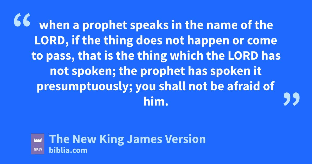 17 “And the Lord said to me: s‘What they have spoken is good. 18 tI will raise up for them a Prophet like you from among their brethren, and uwill put My words in His mouth, vand He shall speak to them all that I command Him. 19 wAnd it shall be that whoever will not hear My words, which He speaks in My name, I will require it of him. 20 But xthe prophet who presumes to speak a word in My name, which I have not commanded him to speak, or ywho speaks in the name of other gods, that prophet shall die.’ 21 And if you say in your heart, ‘How shall we know the word which the Lord has not spoken?’—22 zwhen a prophet speaks in the name of the Lord, aif the thing does not happen or come to pass, that is the thing which the Lord has not spoken; the prophet has spoken it bpresumptuously; you shall not be afraid of him.