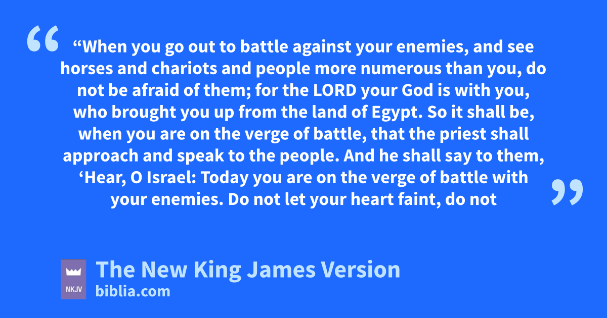 20 “When you go out to battle against your enemies, and see ahorses and chariots and people more numerous than you, do not be bafraid of them; for the Lord your God is cwith you, who brought you up from the land of Egypt. 2 So it shall be, when you are on the verge of battle, that the priest shall approach and speak to the people. 3 And he shall say to them, ‘Hear, O Israel: Today you are on the verge of battle with your enemies. Do not let your heart faint, do not be afraid, and do not tremble or be terrified because of them; 4 for the Lord your God is He who goes with you, dto fight for you against your enemies, to save you.’