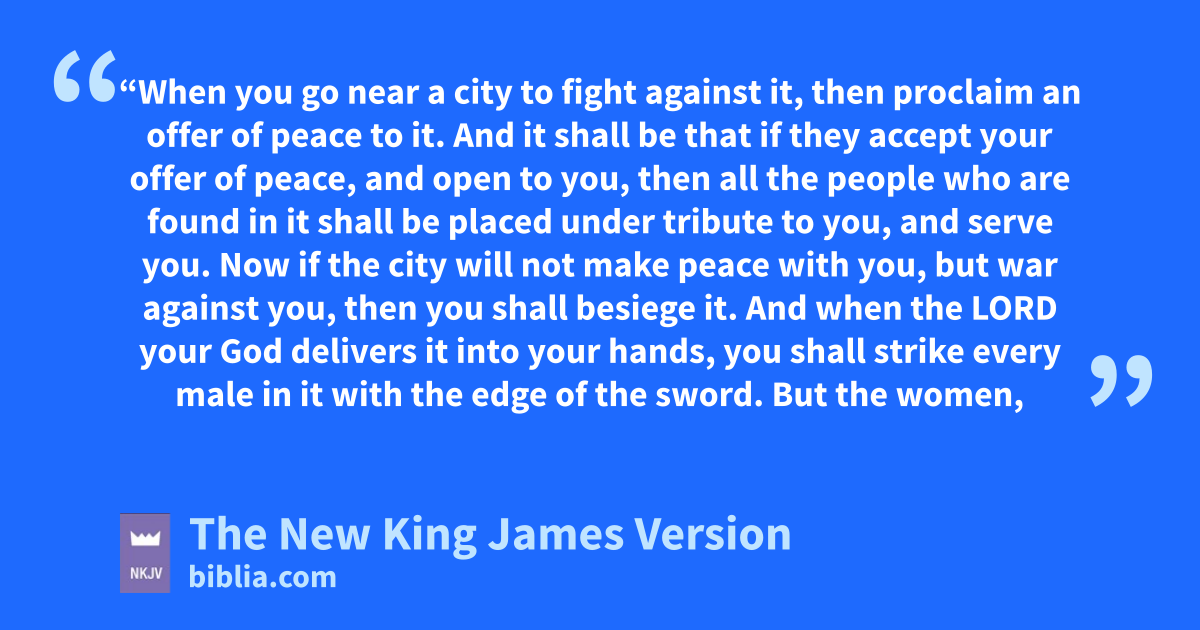 10 “When you go near a city to fight against it, hthen proclaim an offer of peace to it. 11 And it shall be that if they accept your offer of peace, and open to you, then all the people who are found in it shall be placed under tribute to you, and serve you. 12 Now if the city will not make peace with you, but war against you, then you shall besiege it. 13 And when the Lord your God delivers it into your hands, iyou shall strike every male in it with the edge of the sword. 14 But the women, the little ones, jthe livestock, and all that is in the city, all its spoil, you shall plunder for yourself; and kyou shall eat the enemies’ plunder which the Lord your God gives you. 15 Thus you shall do to all the cities which are very far from you, which are not of the cities of these nations.
