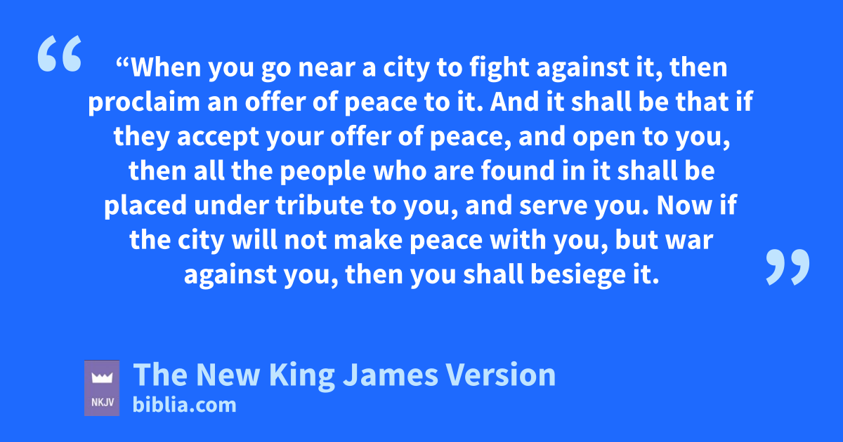 10 “When you go near a city to fight against it, hthen proclaim an offer of peace to it. 11 And it shall be that if they accept your offer of peace, and open to you, then all the people who are found in it shall be placed under tribute to you, and serve you. 12 Now if the city will not make peace with you, but war against you, then you shall besiege it. 13 And when the Lord your God delivers it into your hands, iyou shall strike every male in it with the edge of the sword. 14 But the women, the little ones, jthe livestock, and all that is in the city, all its spoil, you shall plunder for yourself; and kyou shall eat the enemies’ plunder which the Lord your God gives you. 15 Thus you shall do to all the cities which are very far from you, which are not of the cities of these nations.