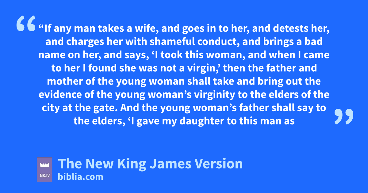 13 “If any man takes a wife, and goes in to her, and idetests her, 14 and charges her with shameful conduct, and brings a bad name on her, and says, ‘I took this woman, and when I came to her I found she was not a virgin,’ 15 then the father and mother of the young woman shall take and bring out the evidence of the young woman’s virginity to the elders of the city at the gate. 16 And the young woman’s father shall say to the elders, ‘I gave my daughter to this man as wife, and he detests her. 17 Now he has charged her with shameful conduct, saying, “I found your daughter was not a virgin,” and yet these are the evidences of my daughter’s virginity.’ And they shall spread the cloth before the elders of the city. 18 Then the elders of that city shall take that man and punish him; 19 and they shall fine him one hundred shekels of silver and give them to the father of the young woman, because he has brought a bad name on a virgin of Israel. And she shall be his wife; he cannot divorce her all his days.