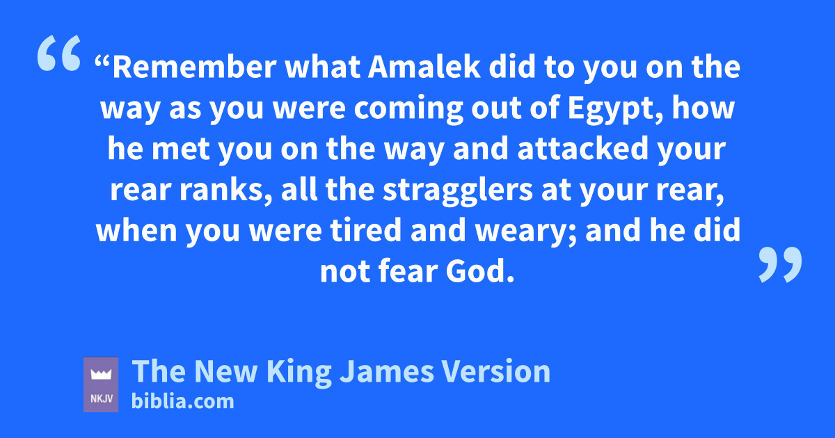 17 s“Remember what Amalek did to you on the way as you were coming out of Egypt, 18 how he met you on the way and attacked your rear ranks, all the stragglers at your rear, when you were tired and weary; and he tdid not fear God. 19 Therefore it shall be, uwhen the Lord your God has given you rest from your enemies all around, in the land which the Lord your God is giving you to possess as an inheritance, that you will vblot out the remembrance of Amalek from under heaven. You shall not forget.