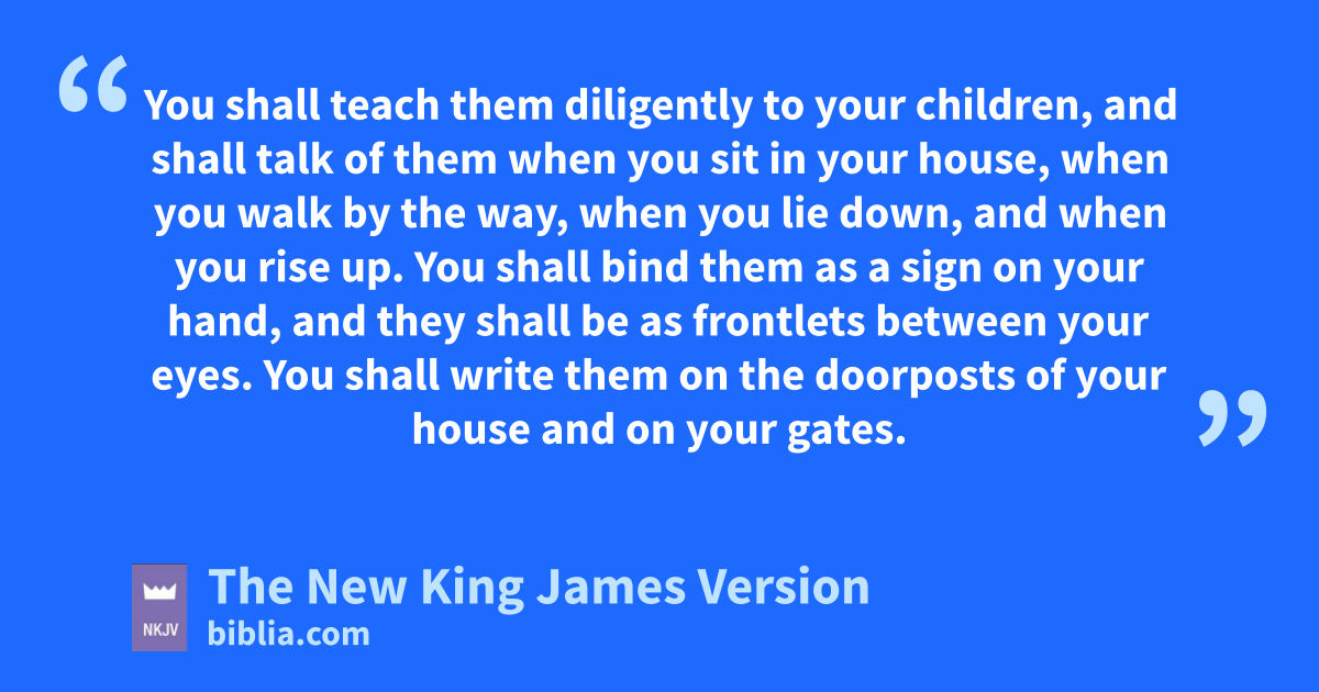 6 “And jthese words which I command you today shall be in your heart. 7 kYou shall teach them diligently to your children, and shall talk of them when you sit in your house, when you walk by the way, when you lie down, and when you rise up. 8 lYou shall bind them as a sign on your hand, and they shall be as frontlets between your eyes. 9 mYou shall write them on the doorposts of your house and on your gates.