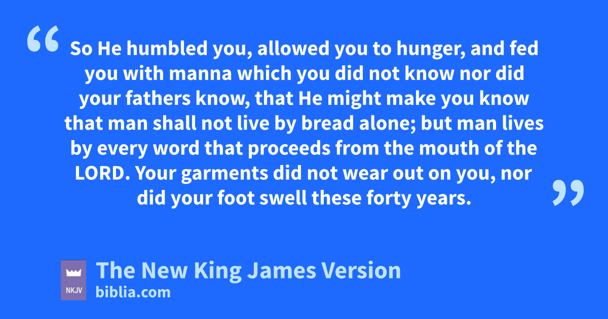8 “Every commandment which I command you today ayou must 1be careful to observe, that you may live and bmultiply, 2and go in and possess the land of which the Lord 3swore to your fathers. 2 And you shall remember that the Lord your God cled you all the way these forty years in the wilderness, to humble you and dtest you, eto know what was in your heart, whether you would keep His commandments or not. 3 So He humbled you, fallowed you to hunger, and gfed you with manna which you did not know nor did your fathers know, that He might make you know that man shall hnot live by bread alone; but man lives by every word that proceeds from the mouth of the Lord. 4 iYour garments did not wear out on you, nor did your foot swell these forty years. 5 jYou should 4know in your heart that as a man chastens his son, so the Lord your God chastens you.