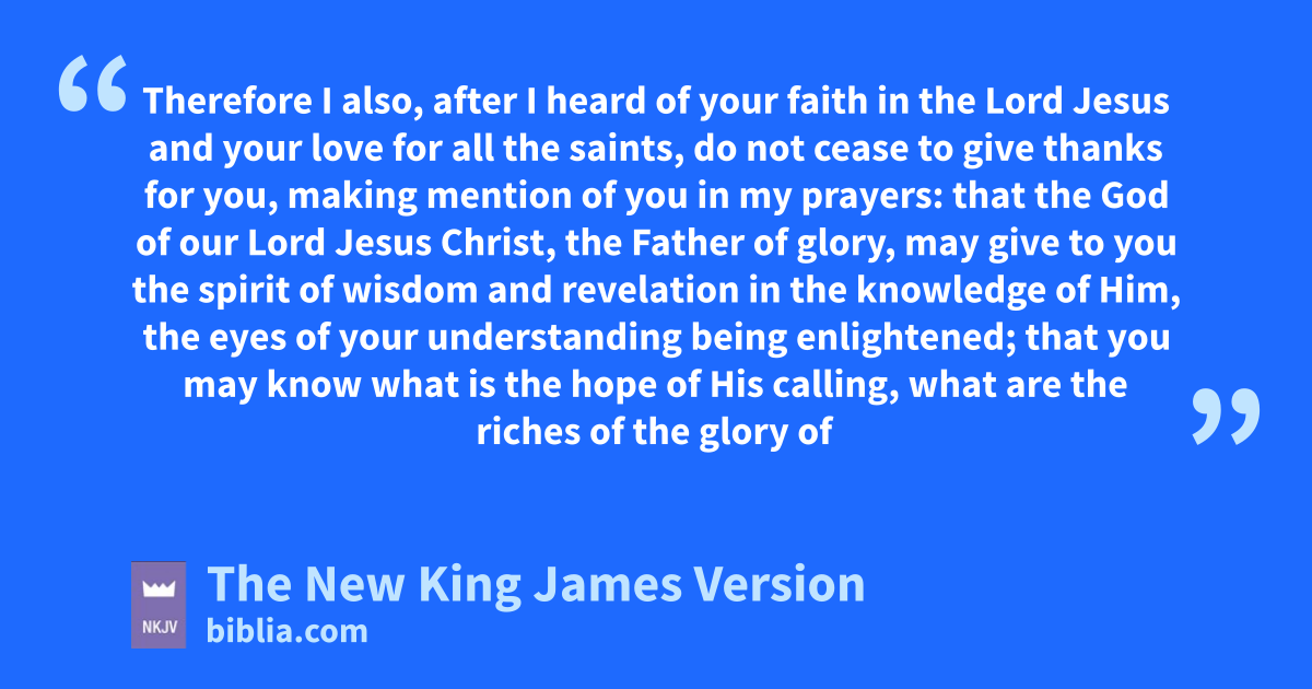 15 Therefore I also, aafter I heard of your faith in the Lord Jesus and your love for all the saints, 16 bdo not cease to give thanks for you, making mention of you in my prayers: 17 that cthe God of our Lord Jesus Christ, the Father of glory, dmay give to you the spirit of wisdom and revelation in the knowledge of Him, 18 ethe eyes of your 6understanding being enlightened; that you may know what is fthe hope of His calling, what are the riches of the glory of His inheritance in the saints, 19 and what is the exceeding greatness of His power toward us who believe, gaccording to the working of His mighty power 20 which He worked in Christ when hHe raised Him from the dead and iseated Him at His right hand in the heavenly places, 21 jfar above all kprincipality 7and 8power and 9might and dominion, and every name that is named, not only in this age but also in that which is to come.