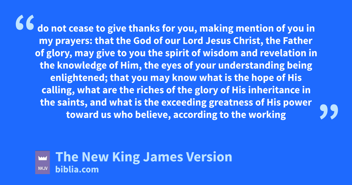 15 Therefore I also, aafter I heard of your faith in the Lord Jesus and your love for all the saints, 16 bdo not cease to give thanks for you, making mention of you in my prayers: 17 that cthe God of our Lord Jesus Christ, the Father of glory, dmay give to you the spirit of wisdom and revelation in the knowledge of Him, 18 ethe eyes of your 6understanding being enlightened; that you may know what is fthe hope of His calling, what are the riches of the glory of His inheritance in the saints, 19 and what is the exceeding greatness of His power toward us who believe, gaccording to the working of His mighty power 20 which He worked in Christ when hHe raised Him from the dead and iseated Him at His right hand in the heavenly places, 21 jfar above all kprincipality 7and 8power and 9might and dominion, and every name that is named, not only in this age but also in that which is to come.
