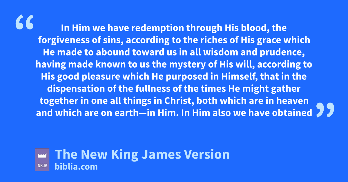 7 jIn Him we have redemption through His blood, the forgiveness of sins, according to kthe riches of His grace 8 which He made to abound toward us in all wisdom and 2prudence, 9 lhaving made known to us the mystery of His will, according to His good pleasure mwhich He purposed in Himself, 10 that in the dispensation of nthe fullness of the times oHe might gather together in one pall things in Christ, 3both which are in heaven and which are on earth—in Him. 11 qIn Him also we have obtained an inheritance, being predestined according to rthe purpose of Him who works all things according to the counsel of His will, 12 sthat we twho first trusted in Christ should be to the praise of His glory.
