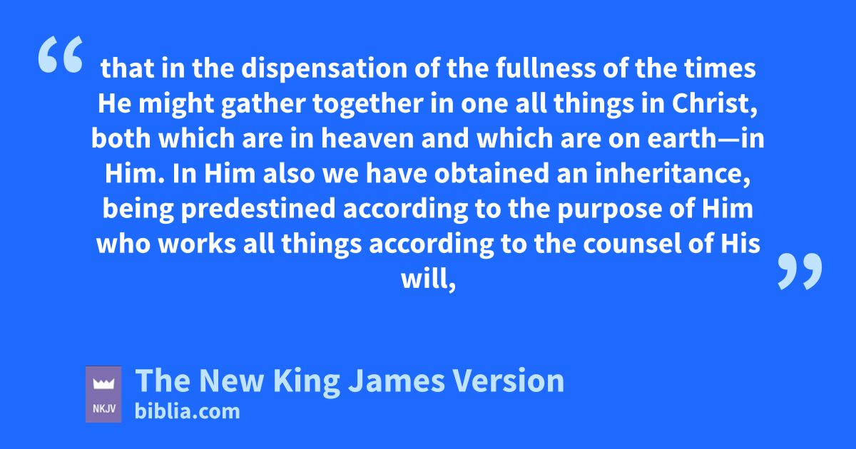 7 jIn Him we have redemption through His blood, the forgiveness of sins, according to kthe riches of His grace 8 which He made to abound toward us in all wisdom and 2prudence, 9 lhaving made known to us the mystery of His will, according to His good pleasure mwhich He purposed in Himself, 10 that in the dispensation of nthe fullness of the times oHe might gather together in one pall things in Christ, 3both which are in heaven and which are on earth—in Him. 11 qIn Him also we have obtained an inheritance, being predestined according to rthe purpose of Him who works all things according to the counsel of His will, 12 sthat we twho first trusted in Christ should be to the praise of His glory.