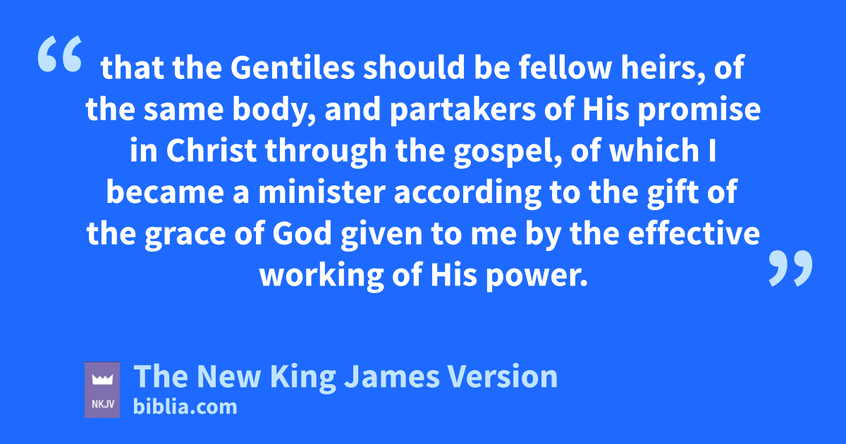 3 For this reason I, Paul, the prisoner of Christ Jesus for you Gentiles—2 if indeed you have heard of the 1dispensation of the grace of God awhich was given to me for you, 3 bhow that by revelation cHe made known to me the mystery (as I have briefly written already, 4 by which, when you read, you may understand my knowledge in the mystery of Christ), 5 which in other ages was not made known to the sons of men, as it has now been revealed by the Spirit to His holy apostles and prophets: 6 that the Gentiles dshould be fellow heirs, of the same body, and partakers of His promise in Christ through the gospel, 7 eof which I became a minister faccording to the gift of the grace of God given to me by gthe effective working of His power.