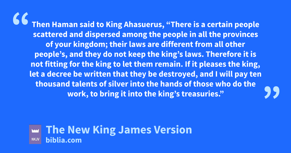 8 Then Haman said to King Ahasuerus, “There is a certain people scattered and dispersed among the people in all the provinces of your kingdom; jtheir laws are different from all other people’s, and they do not keep the king’s laws. Therefore it is not fitting for the king to let them remain. 9 If it pleases the king, let a decree be written that they be destroyed, and I will pay ten thousand talents of silver into the hands of those who do the work, to bring it into the king’s treasuries.”