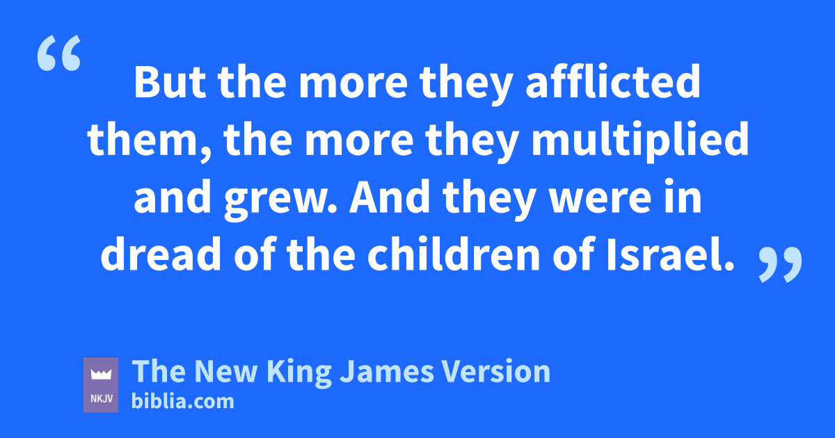8 Now there arose a new king over Egypt, ewho did not know Joseph. 9 And he said to his people, “Look, the people of the children of Israel are more and fmightier than we; 10 gcome, let us hdeal shrewdly with them, lest they multiply, and it happen, in the event of war, that they also join our enemies and fight against us, and so go up out of the land.” 11 Therefore they set taskmasters over them ito afflict them with their jburdens. And they built for Pharaoh ksupply cities, Pithom land Raamses. 12 But the more they afflicted them, the more they multiplied and grew. And they were in dread of the children of Israel. 13 So the Egyptians made the children of Israel mserve with 4rigor. 14 And they nmade their lives bitter with hard bondage—oin mortar, in brick, and in all manner of service in the field. All their service in which they made them serve was with rigor.