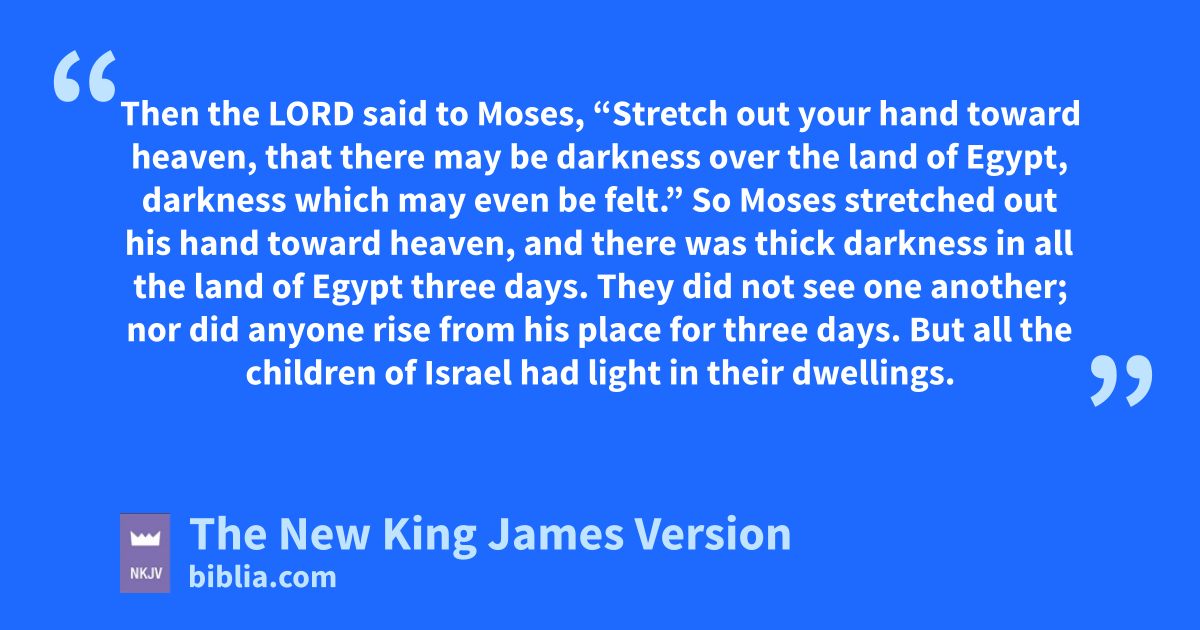 21 Then the Lord said to Moses, z“Stretch out your hand toward heaven, that there may be darkness over the land of Egypt, 2darkness which may even be felt.” 22 So Moses stretched out his hand toward heaven, and there was athick darkness in all the land of Egypt bthree days. 23 They did not see one another; nor did anyone rise from his place for three days. cBut all the children of Israel had light in their dwellings.