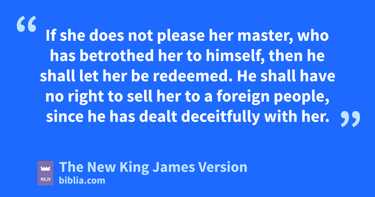 7 “And if a man esells his daughter to be a female slave, she shall not go out as the male slaves do. 8 If she 2does not please her master, who has betrothed her to himself, then he shall let her be redeemed. He shall have no right to sell her to a foreign people, since he has dealt deceitfully with her. 9 And if he has betrothed her to his son, he shall deal with her according to the custom of daughters. 10 If he takes another wife, he shall not diminish her food, her clothing, fand her marriage rights. 11 And if he does not do these three for her, then she shall go out free, without paying money.