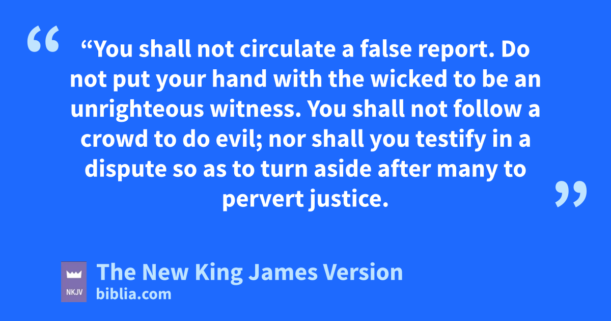 23 “You ashall not circulate a false report. Do not put your hand with the wicked to be an bunrighteous witness. 2 cYou shall not follow a crowd to do evil; dnor shall you testify in a dispute so as to turn aside after many to pervert justice. 3 You shall not show partiality to a epoor man in his dispute.