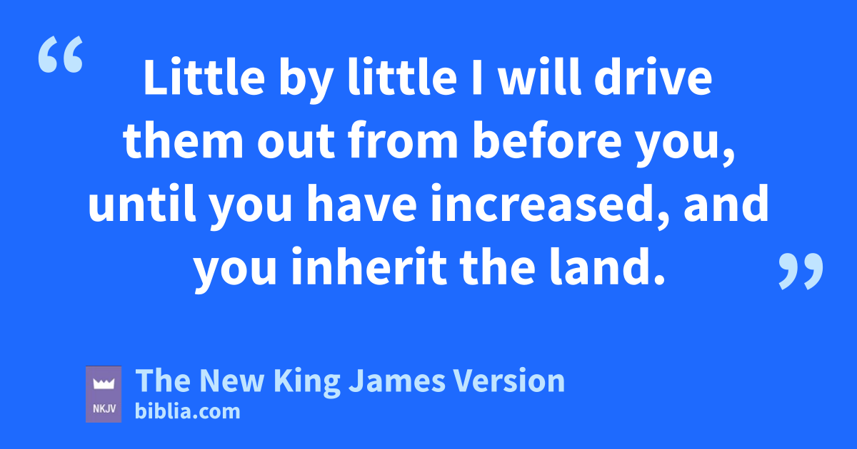 27 “I will send qMy fear before you, I will rcause confusion among all the people to whom you come, and will make all your enemies turn their backs to you. 28 And sI will send hornets before you, which shall drive out the Hivite, the Canaanite, and the Hittite from before you. 29 tI will not drive them out from before you in one year, lest the land become desolate and the beasts of the field become too numerous for you. 30 Little by little I will drive them out from before you, until you have increased, and you inherit the land. 31 And uI will set your 6bounds from the Red Sea to the sea, Philistia, and from the desert to the 7River. For I will vdeliver the inhabitants of the land into your hand, and you shall drive them out before you. 32 wYou shall make no 8covenant with them, nor with their gods. 33 They shall not dwell in your land, lest they make you sin against Me. For if you serve their gods, xit will surely be a snare to you.”