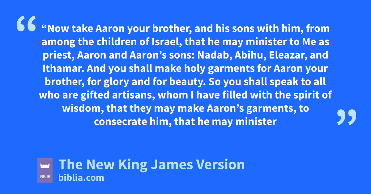 28 “Now take aAaron your brother, and his sons with him, from among the children of Israel, that he may minister to Me as bpriest, Aaron and Aaron’s sons: cNadab, Abihu, dEleazar, and Ithamar. 2 And eyou shall make 1holy garments for Aaron your brother, for glory and for beauty. 3 So fyou shall speak to all who are gifted artisans, gwhom I have filled with the spirit of wisdom, that they may make Aaron’s garments, to consecrate him, that he may minister to Me as priest. 4 And these are the garments which they shall make: ha breastplate, ian 2ephod, ja robe, ka skillfully woven tunic, a turban, and la sash. So they shall make holy garments for Aaron your brother and his sons, that he may minister to Me as priest.