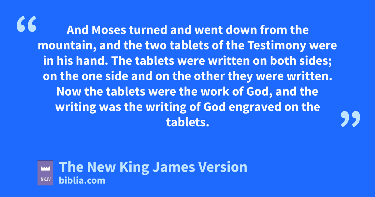15 And yMoses turned and went down from the mountain, and the two tablets of the Testimony were in his hand. The tablets were written on both sides; on the one side and on the other they were written. 16 Now the ztablets were the work of God, and the writing was the writing of God engraved on the tablets.