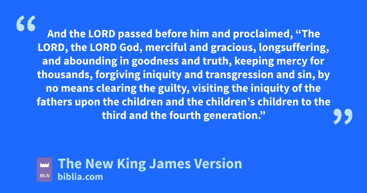 5 Now the Lord descended in the ecloud and stood with him there, and fproclaimed the name of the Lord. 6 And the Lord passed before him and proclaimed, “The Lord, the Lord gGod, merciful and gracious, longsuffering, and abounding in hgoodness and itruth, 7 jkeeping mercy for thousands, kforgiving iniquity and transgression and sin, lby no means clearing the guilty, visiting the iniquity of the fathers upon the children and the children’s children to the third and the fourth generation.”